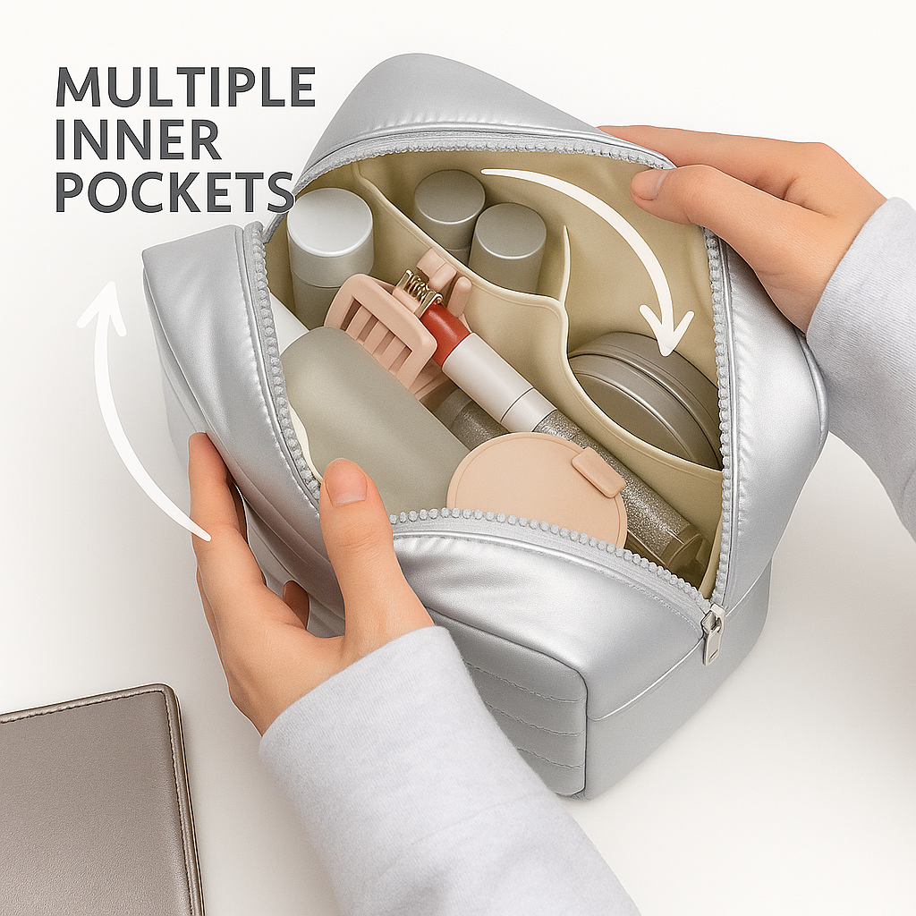 Choose from four elegant colors – Light Purple, Black, Peach, and Silver – to match your style or mood. Whether you're gifting a loved one or treating yourself, this pouch adds a touch of sophistication to any beauty routine.