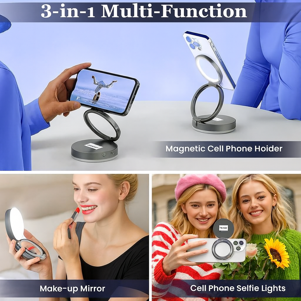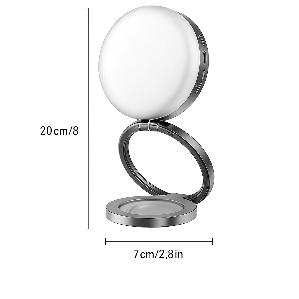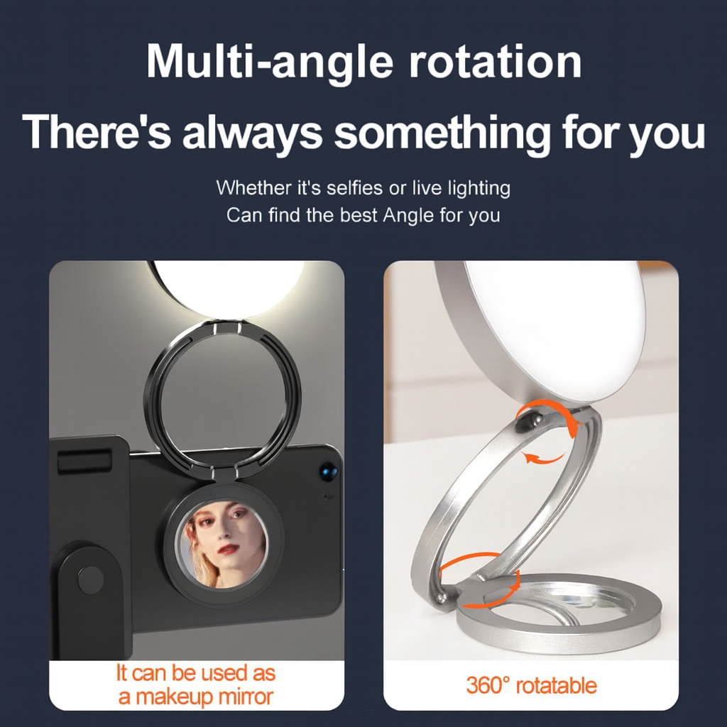 The built-in LED lighting provides soft, natural illumination that highlights every detail of your makeup, while the magnetic phone holder ensures your device stays secure during selfies, video calls, or live streaming. With its multi-angle rotation, you can adjust the mirror and light to the perfect position, making it ideal for makeup application, skincare routines, or even as a desk light.