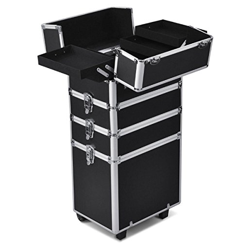 3 in 1 Professional Artist Rolling Trolley Makeup Train Case, Aluminum Cosmetic Organizer Makeup Case 360-degree Wheels For Beauty Chains Shoulder Straps. High-quality sturdy train case with aluminum frame & reinforced steel corners. Carry Handle and Shoulder Strap perfect for traveling to shows or demonstrations. Quality locking latches included with two keys. Large roomy bottom with adjustable dividers perfect for all nail polishes make up brushes, lipsticks, hair accessories, etc.