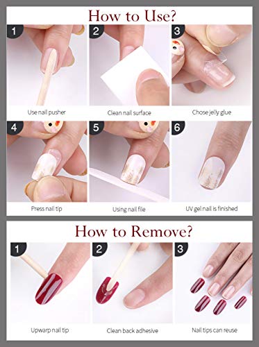 File the sides and cuticle area for an accurate fit with manicure stick, which will wear the false nails better. Clean your nails first, which makes it easier to apply Select the correct size nails for each finger. apply appropriate amount of glue to nails. Put on the false nails and press on them for 5 seconds. File and shape your new nails if needed. â� Tips for remove . Put your nails in warm water for 5 minutes, then use the tooth sticker to gently peel off the nails from side. Do not remove it abruptly which may leave some mark of the nail stickers on your nail surface.